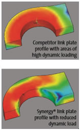 Plate and connecting link design optimizes stress distribution and fatigue performance. Renold Synergy performs, on average, 30 percent better than other brands under repeated shock loading and continual heavy loads.